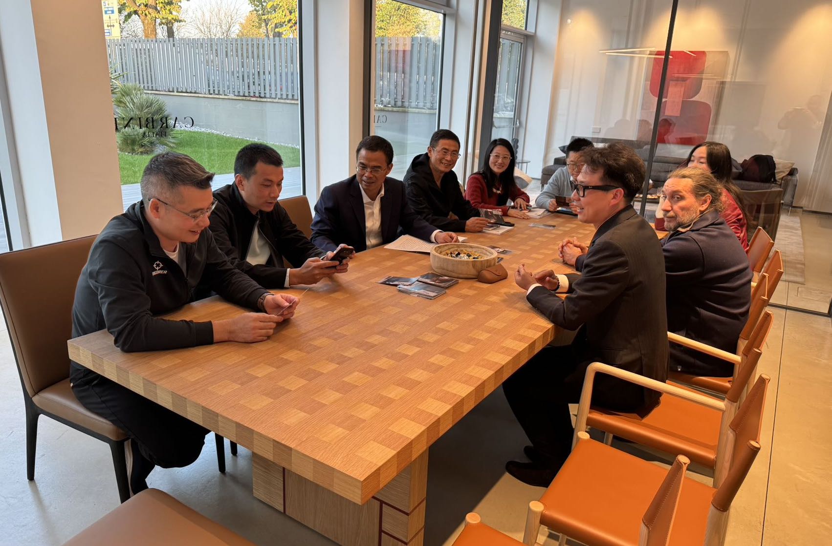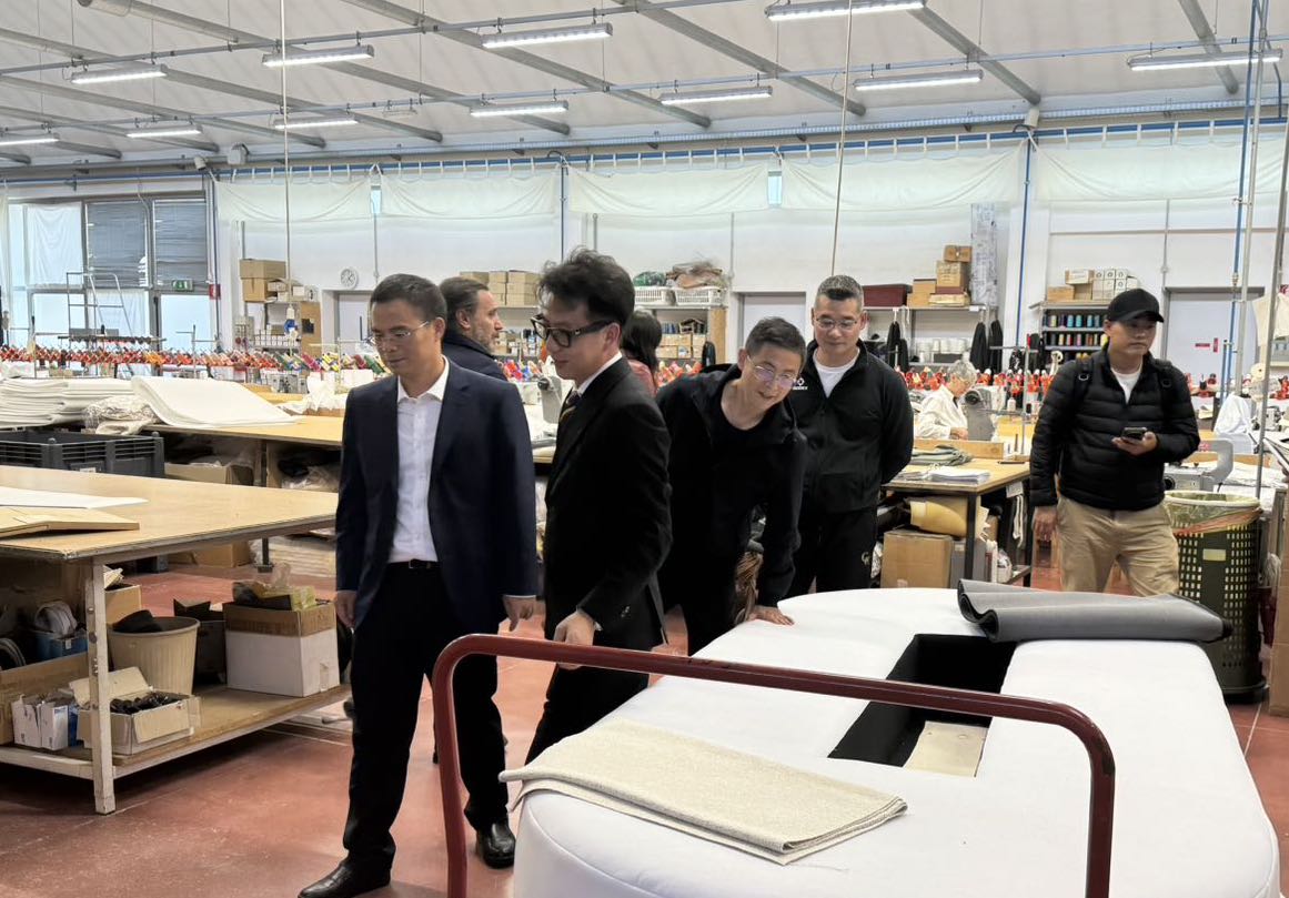 抵达卡缤意大利研发中心后,市领导们首先深入其制造工厂。车间内,先进的设备有序运转,工匠们专注地雕琢着每一件家具。市领导们与工厂创始人及团队亲切沟通,细致了解工厂的发展历史,对意大利精湛的家具工艺特点有了更直观的认识,从传统的手工技艺到现代的数控加工,每一个环节都展现出意大利家具制造的卓越品质。